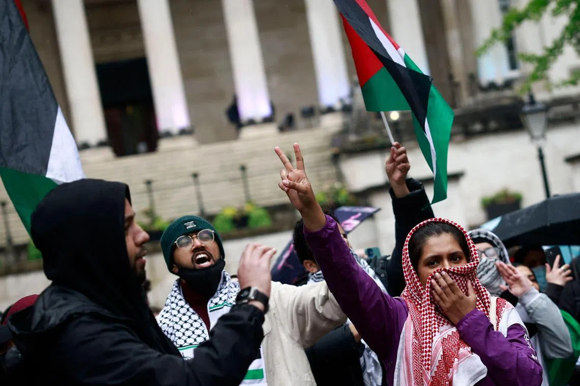 Students waving the Palestinian flag during a protest at University College London, on May 3, 2024.