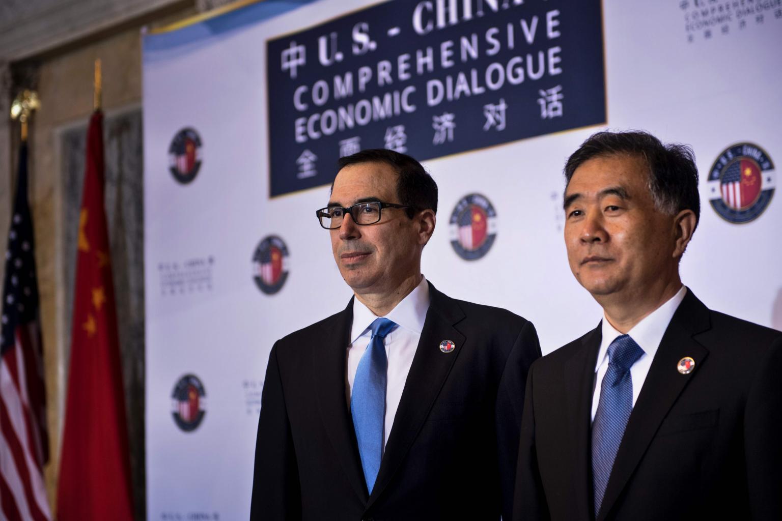 US Secretary of the Treasury Steven Mnuchin (left) and Chinese Vice Premier Wang Yang pose for a photo before an opening session at a US and China comprehensive Economic Dialogue.