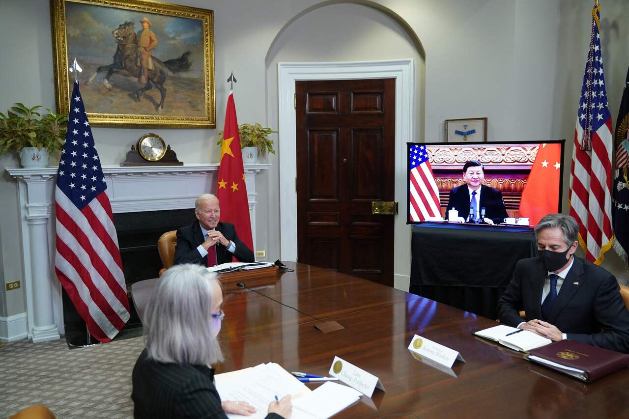 US President Joe Biden meeting Chinese President Xi Jinping virtually from the White House on Nov 15, 2021.