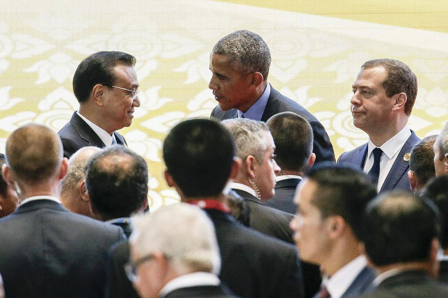 US President Barack Obama (centre) talks to China's Prime Minister Li Keqiang (left) before the start of the 11th East Asia Summit, on Sept 8, 2016.