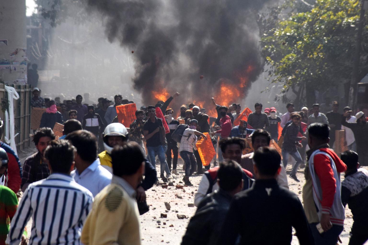Rioters pelt stones during clashes between pro and anti-Citizenship Amendment Act groups, in New Delhi on Feb 24, 2020.