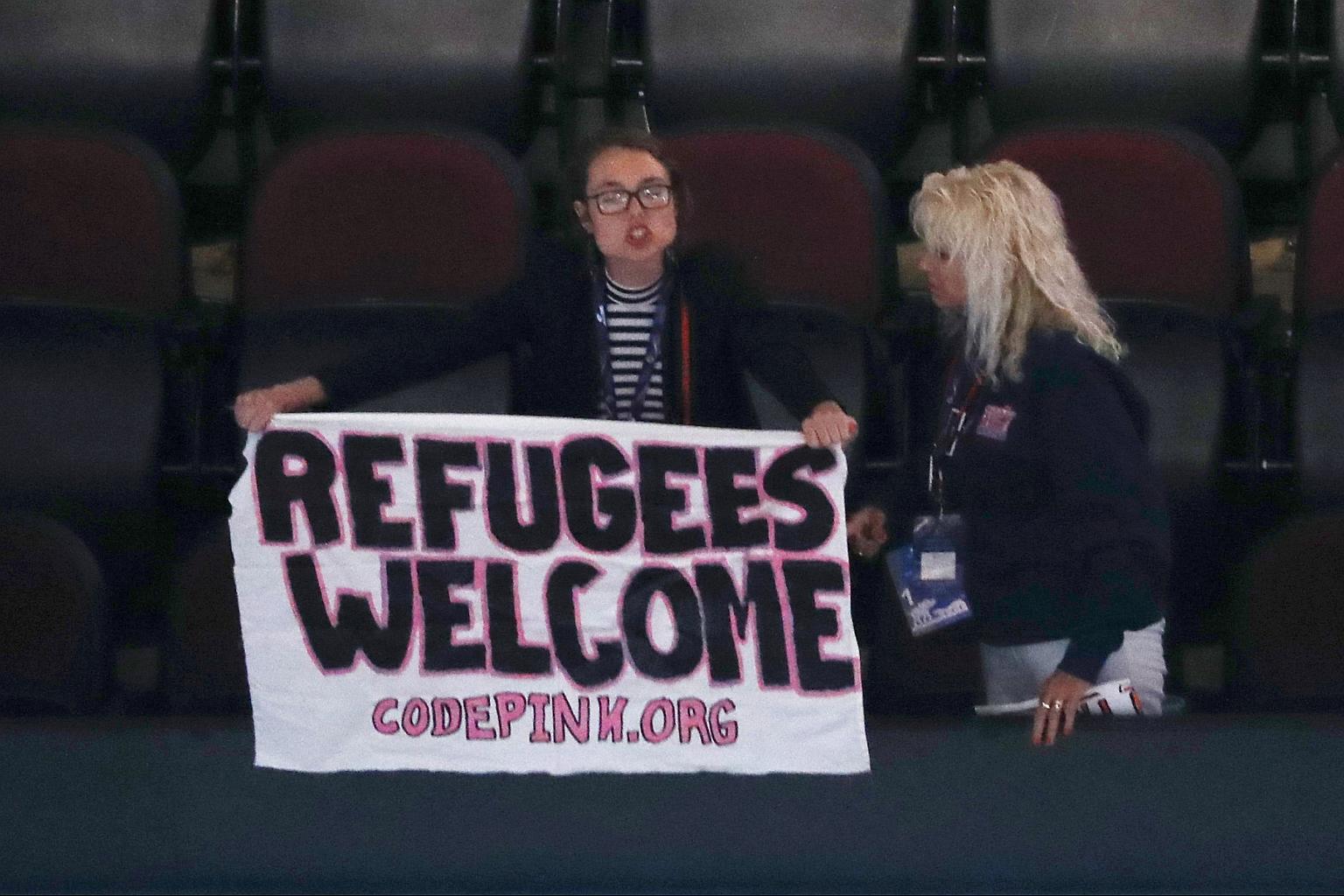 A protester holds up a sign reading "Refugees Welcome" at the Republican National Convention in Cleveland, Ohio, on July 18, 2016.