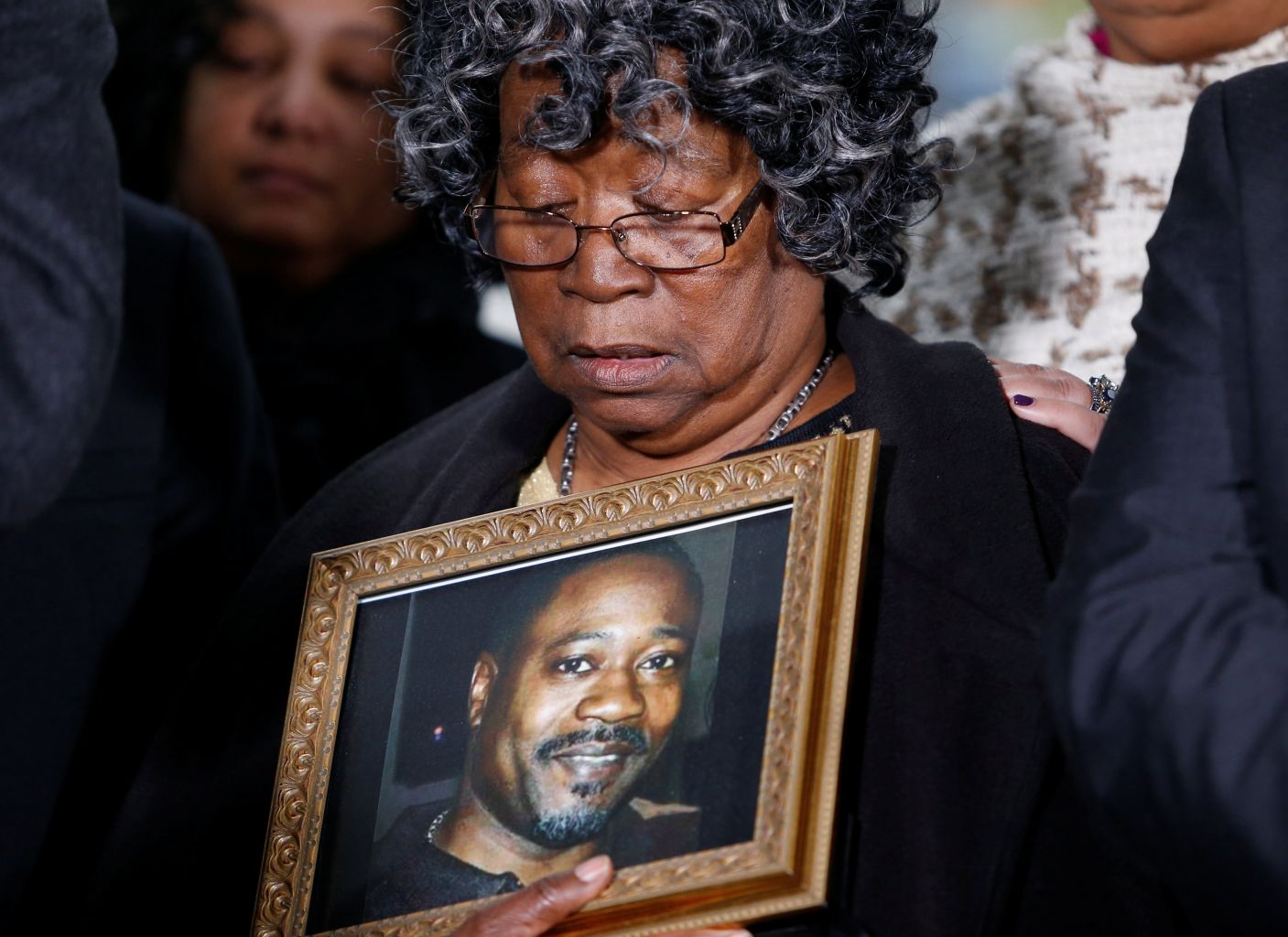 Judy Scott looks over a photo of her son Walter Scott during a news conference, Dec 7, 2017.
