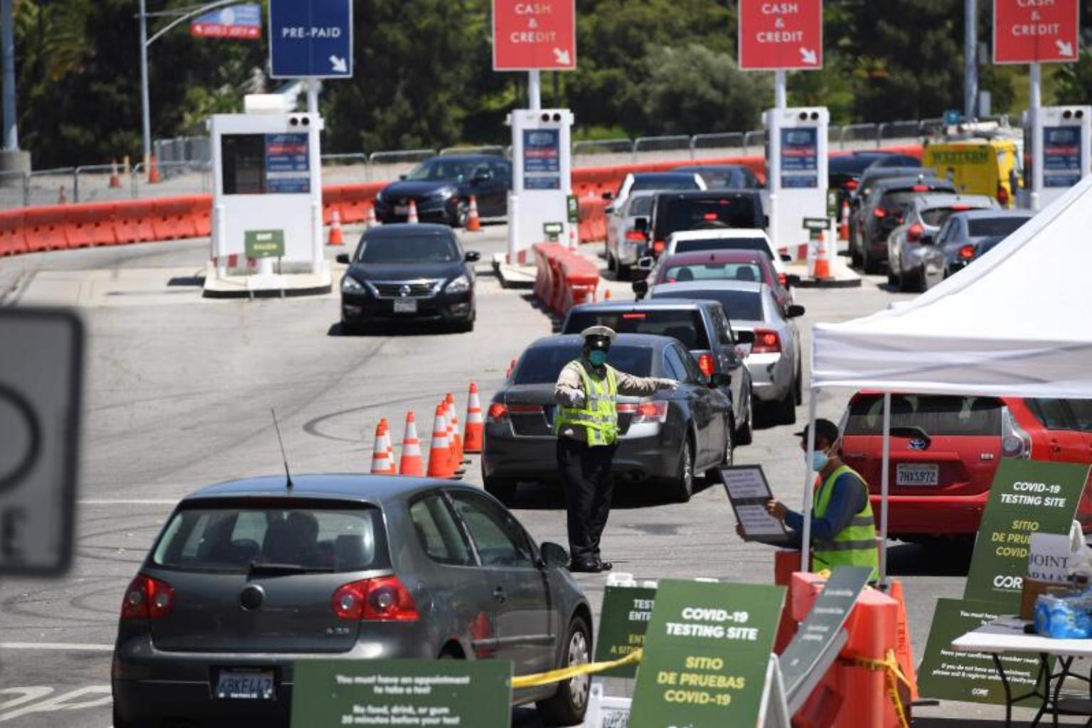 An officer directs cars at a drive-through Covid-19 test site, on July 15, 2020, at Dodgers Stadium in Los Angeles, California.