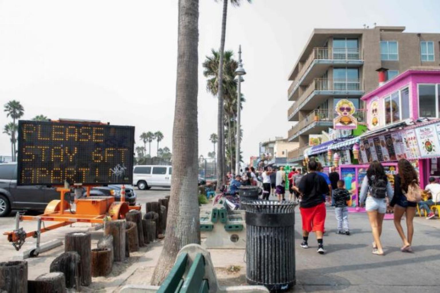 People walk past a sign on the boardwalk in Venice Beach, California, on Sept 15, 2020.