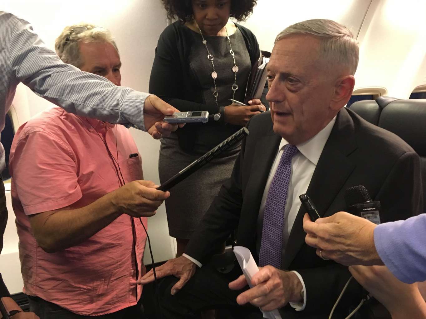 Mattis speaks to reporters aboard a military jet as he heads to Europe, June 27, 2017.