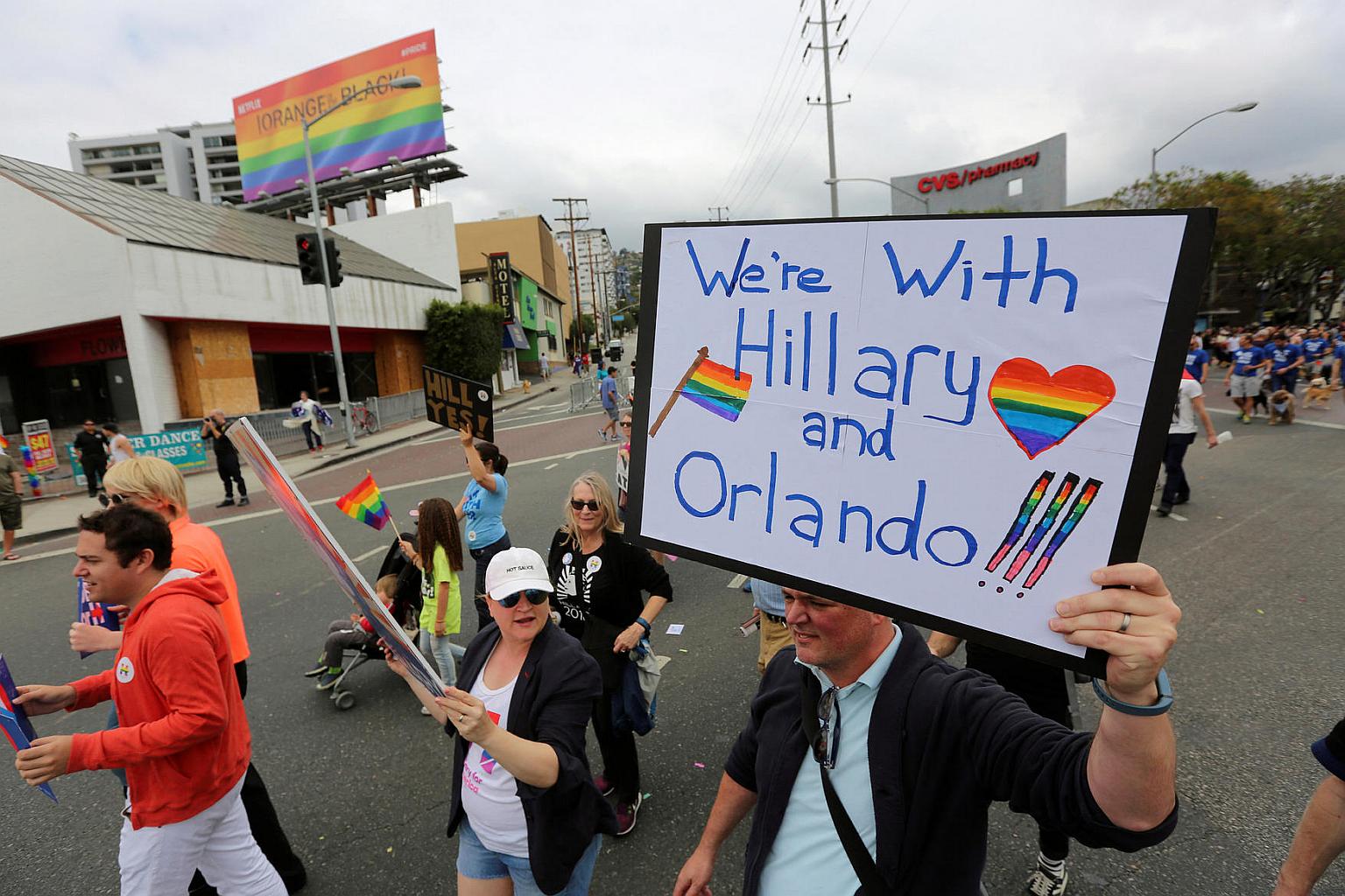 A man carrying a sign supporting both the Orlando shooting victims and Democratic presidential candidate Hillary Clinton at the 46th annual Los Angeles Gay Pride Parade, following the shooting at a nightclub in Orlando.