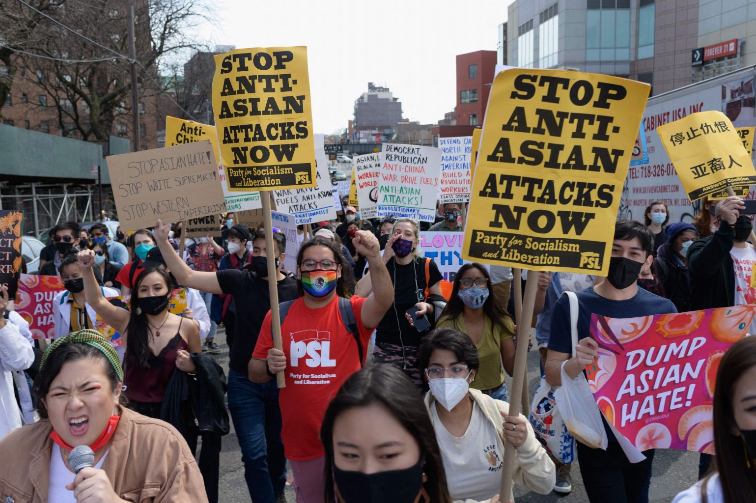Members and supporters of the Asian-American community take part in protests against anti-Asian violence in New York, on March 27, 2021.