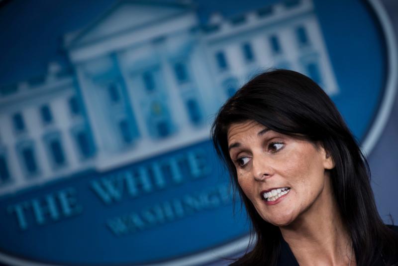 US Ambassador to the UN Nikki Haley speaks during a briefing at the White House on n April 24, 2017.
