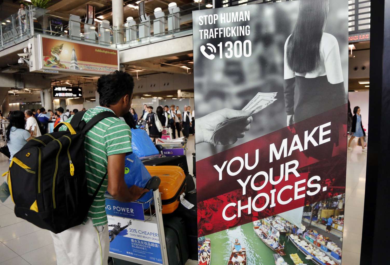 Tourists walk past a Thai government campaign poster to stop human trafficking, in Suvarnabhumi International Airport in Bangkok, on June 17, 2016.