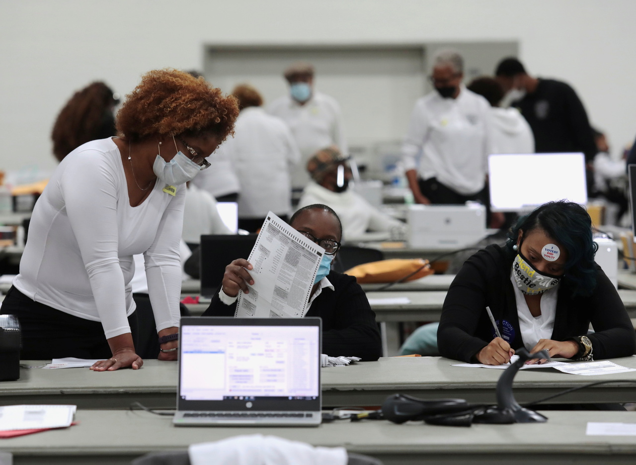 Poll workers tabulate absentee ballots in Detroit, Michigan, on Nov 3, 2020.