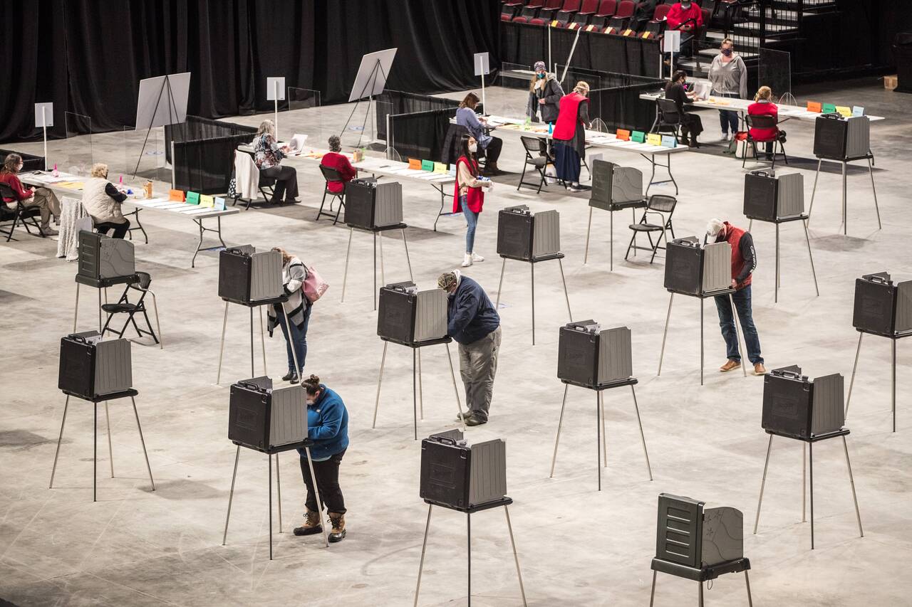 <p>BANGOR, ME - NOVEMBER 03: Voters fill out and cast their ballots at the Cross Insurance Center polling location where the entire city votes on November 3, 2020 in Bangor, Maine. After a record-breaking early voting turnout, Americans head to the polls on the last day to cast their vote for incumbent U.S. President Donald Trump or Democratic nominee Joe Biden in the 2020 presidential election. Scott Eisen/Getty Images/AFP