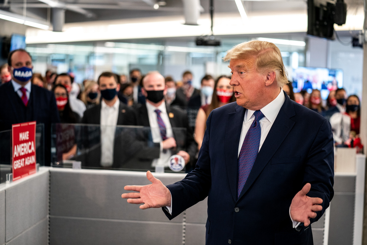 <p>President Donald Trump meets with workers at Trump campaign headquarters in Arlington, Va., on Election Day, Tuesday, Nov. 3, 2020. (Anna Moneymaker/The New York Times)</p>