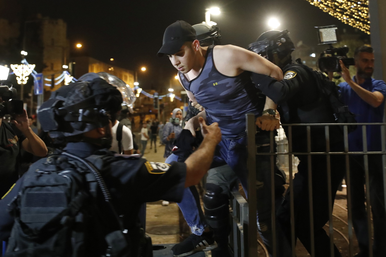 Israeli police arresting a Palestinian protester during a protest near Damascus gate of Jerusalem's old city, on May 9, 2021.