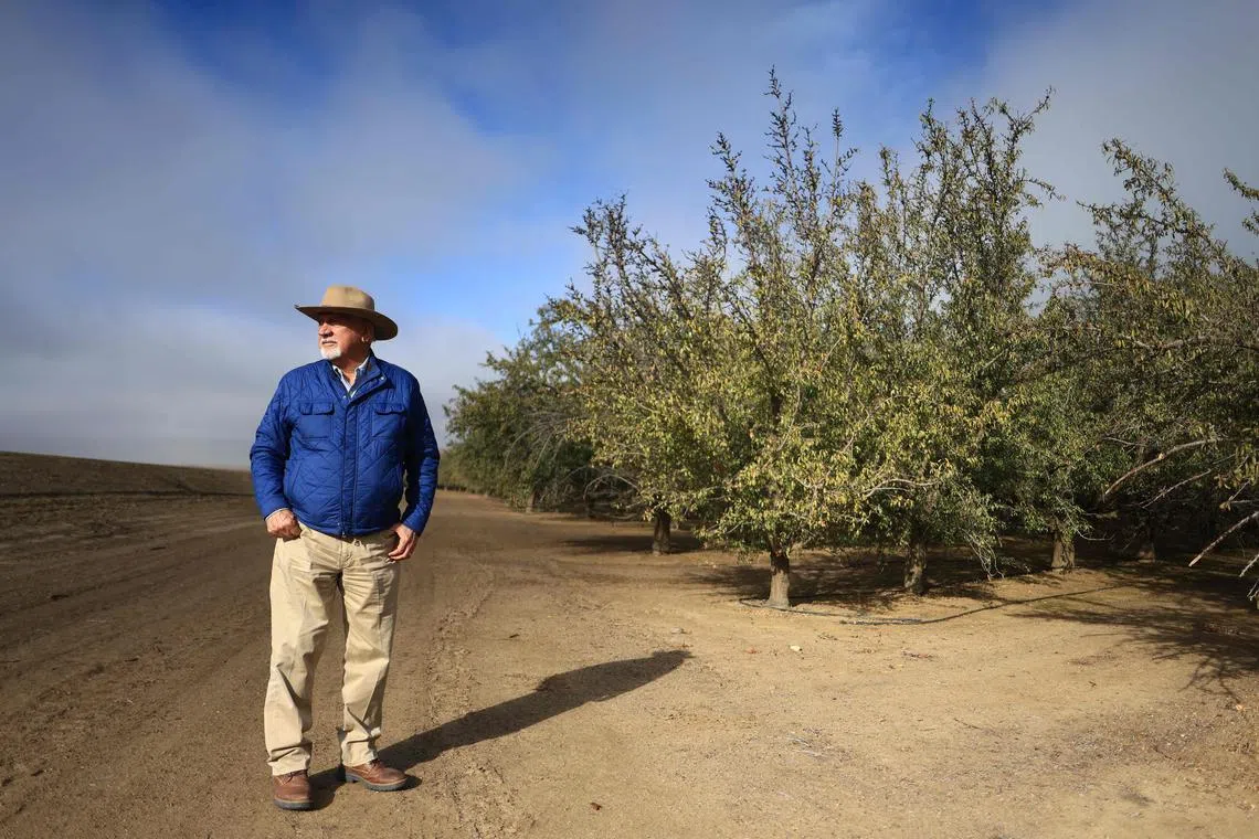 Farmer Joe Del Bosque standing near his almond trees on his land in Firebaugh, California.