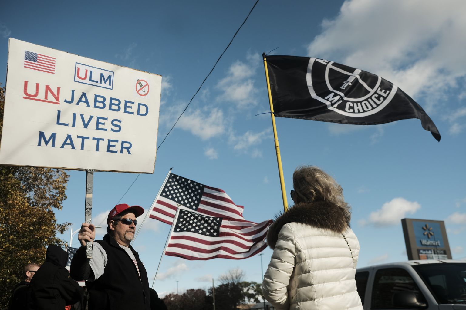 Demonstrators hold signs and wave American flags during a protest against Covid-19 vaccine mandates outside in Warren, Michigan.