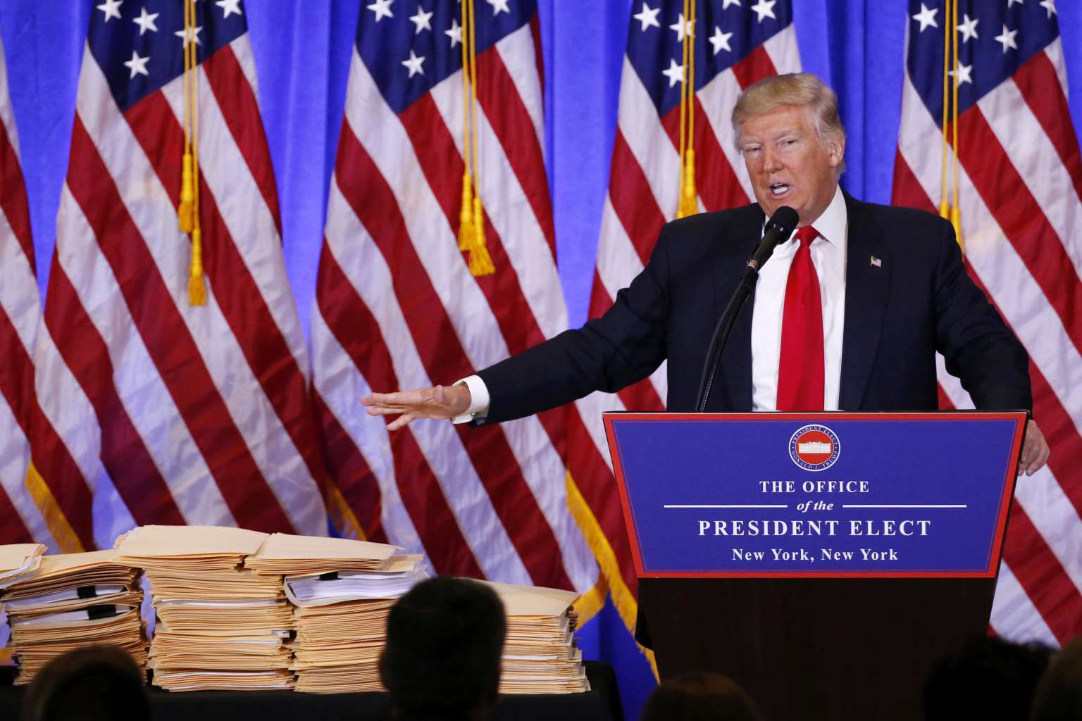 US President-elect Donald Trump speaks during a news conference in the lobby of Trump Tower in Manhattan in New York City on Jan 11, 2017.