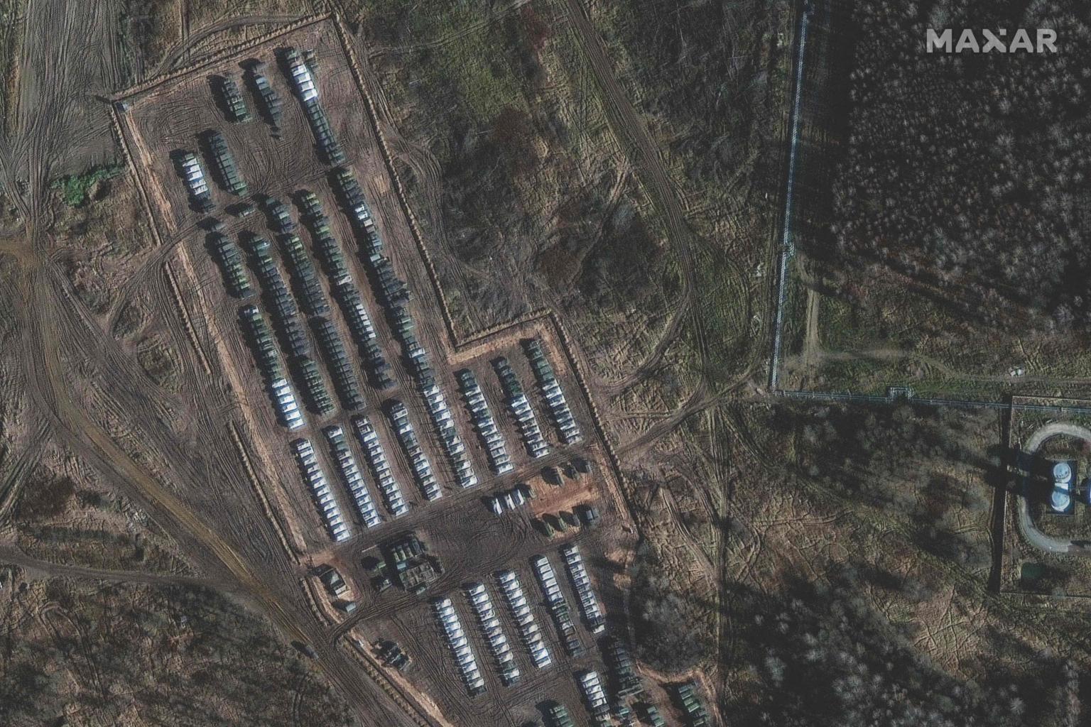A satellite image by Maxar Technologies shows Russian tanks, armoured personnel carriers and support equipment in Yelnya, Russia, on Nov 1, 2021.