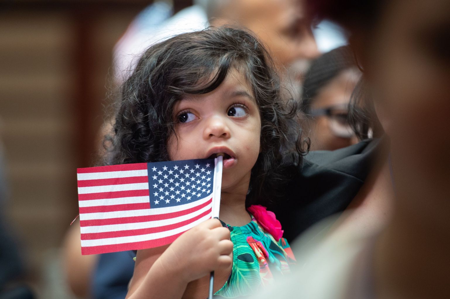 A little girl holds the flag as the US Citizenship and Immigration Services welcomes 200 new citizens from 50 countries during a ceremony in honour of Independence Day at the New York Public Library, July 3, 2018, in New York.