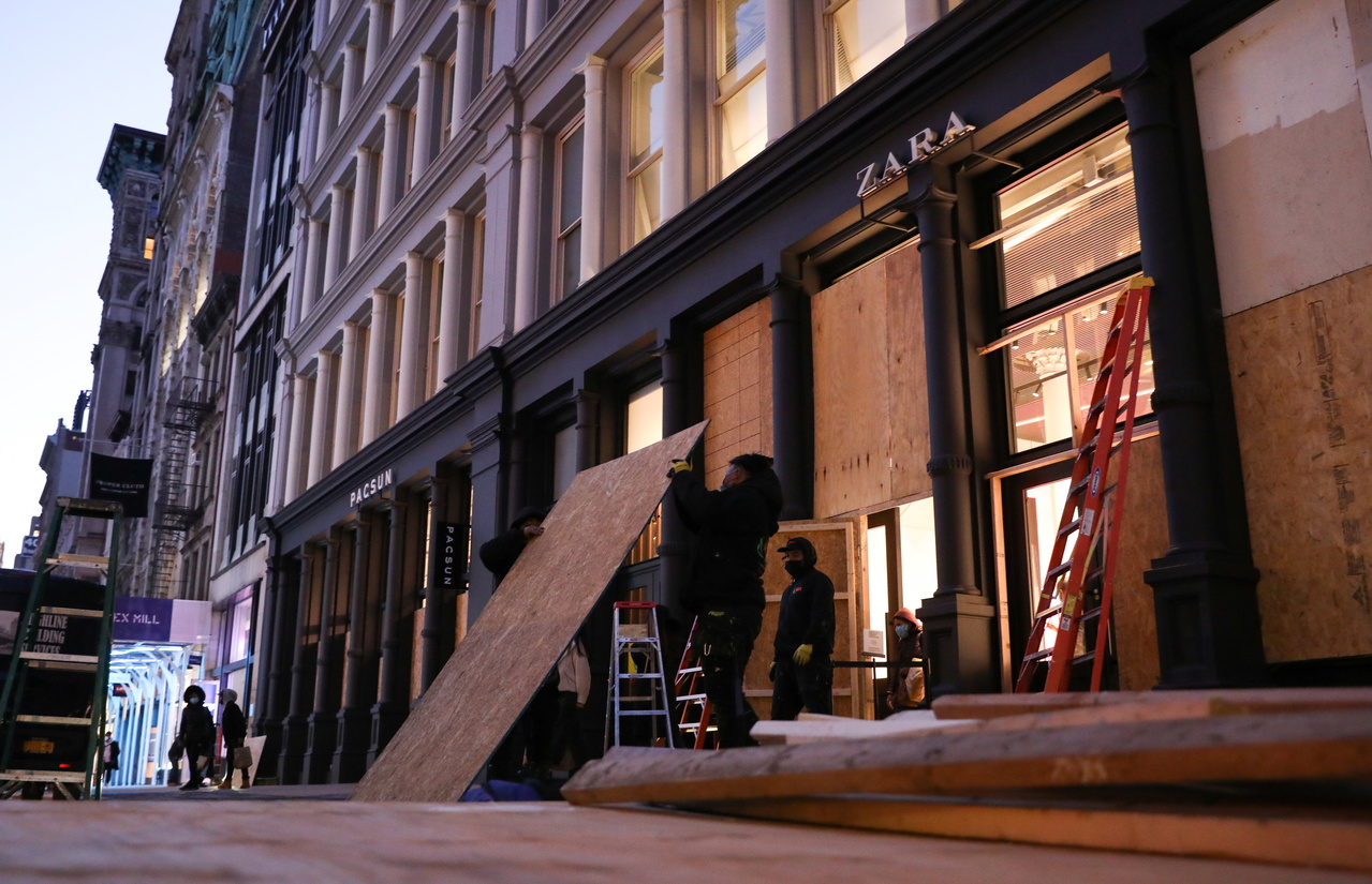 <p>Workers board up a Zara store ahead of election results during the outbreak of coronavirus disease (COVID-19) in Manhattan, New York, U.S., November 2, 2020. REUTERS/Caitlin Ochs</p>