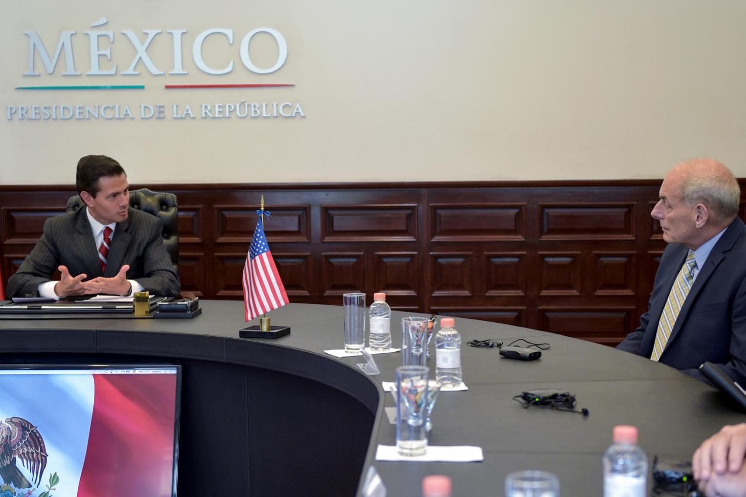 Mexican President Enrique Pena Nieto (left) talking with US Homeland Security Secretary John F. Kelly at Los Pinos presidential residence in Mexico City.