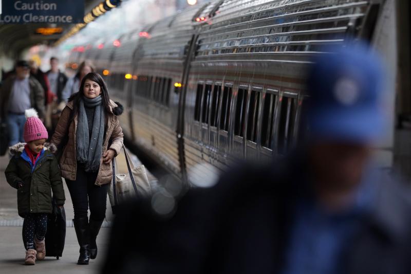 Passengers walking next to an Amtrak train at Union Station in Washington on Nov 27, 2019. The Moving Forward Framework includes US$55 billion in railway investments.