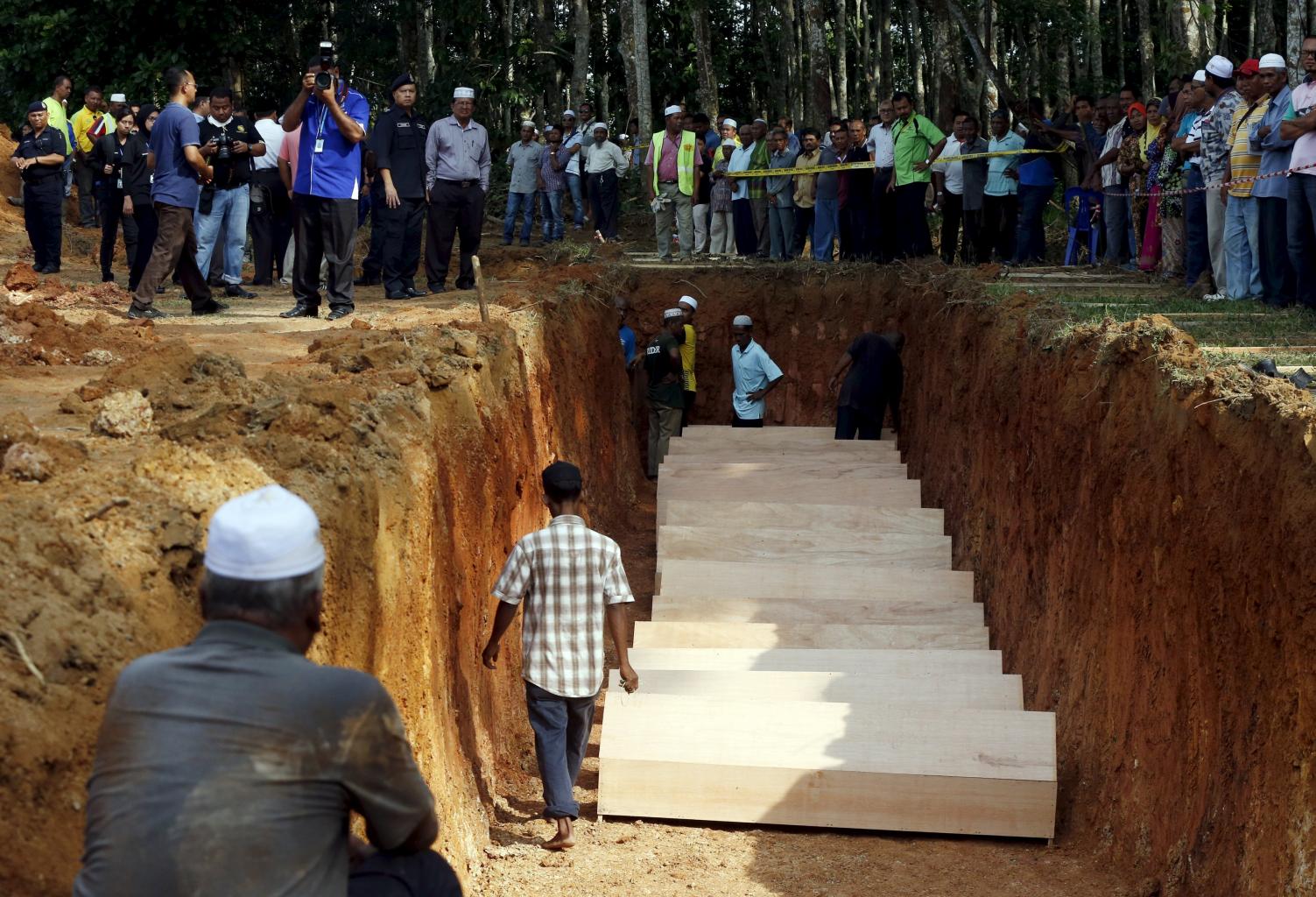 A crowd gathers around a mass grave with the remains of unidentified Rohingya people found at a traffickers camp in Wang Kelian in Malaysia.