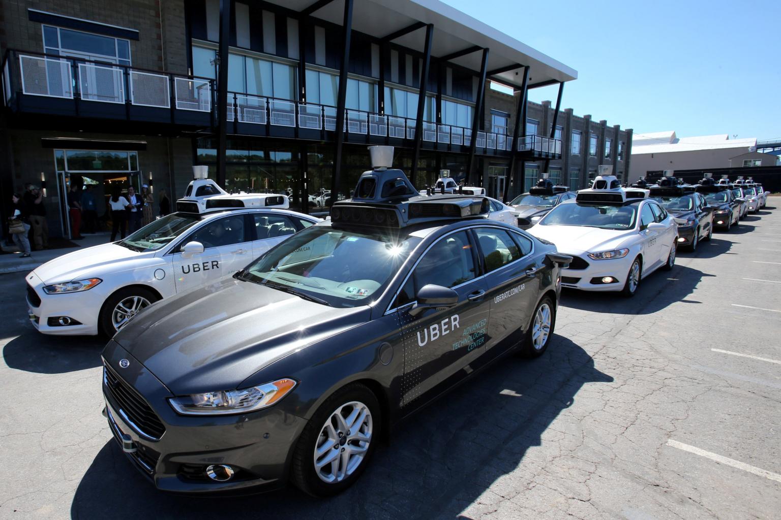 A fleet of Uber's Ford Fusion self-driving cars are shown during a demonstration in Pittsburgh, Pennsylvania.