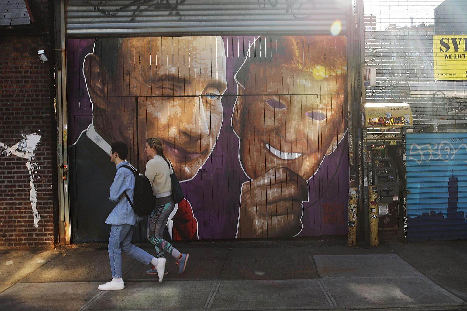 A mural depicting a winking Vladimir Putin taking off his Donald Trump mask is painted on a storefront outside of the Levee bar in Brooklyn.