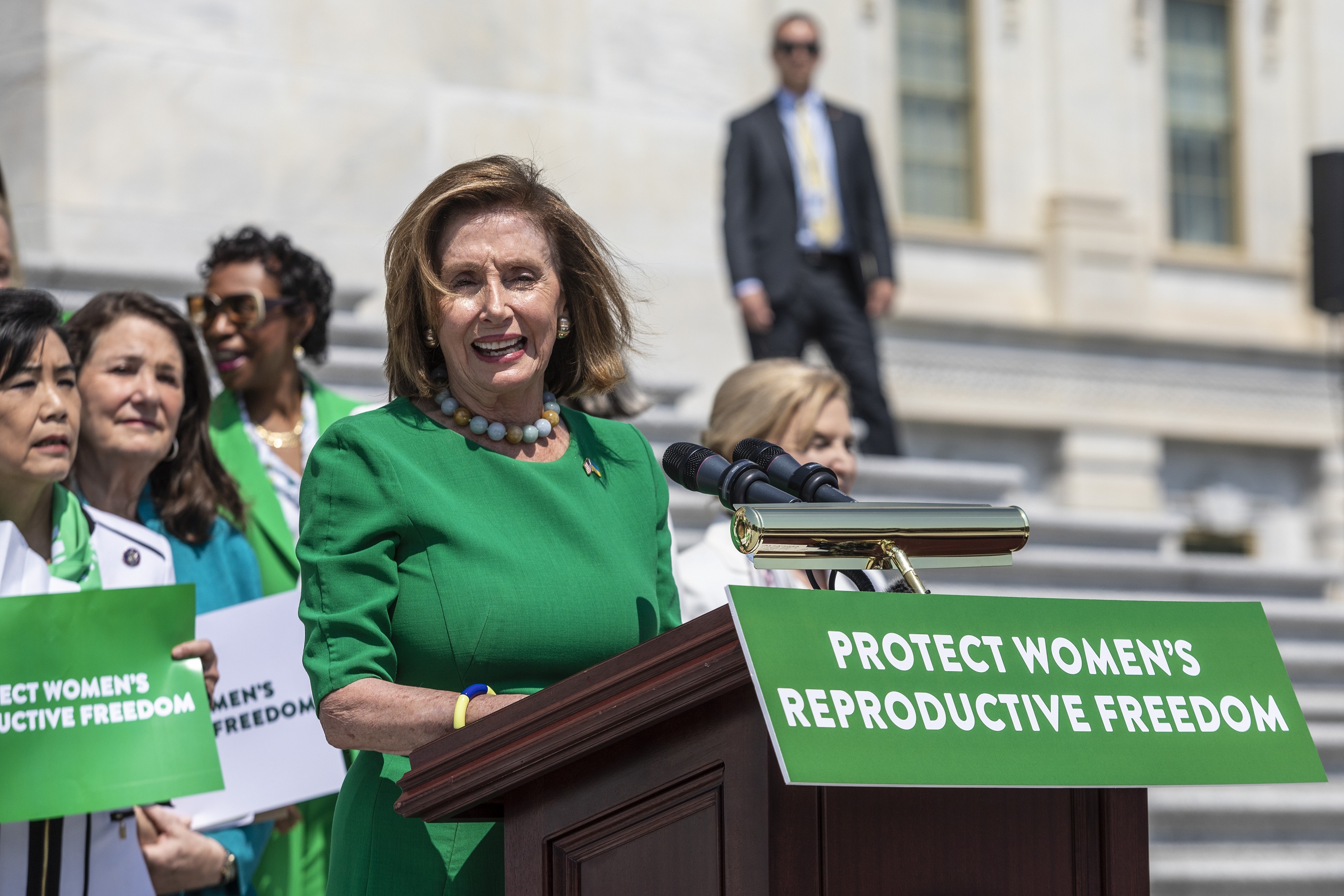 House Speaker Nancy Pelosi is joined by women of the House Democratic Caucus as she speaks outside the Capitol on July 15, 2022, ahead of voting on the two Bills.