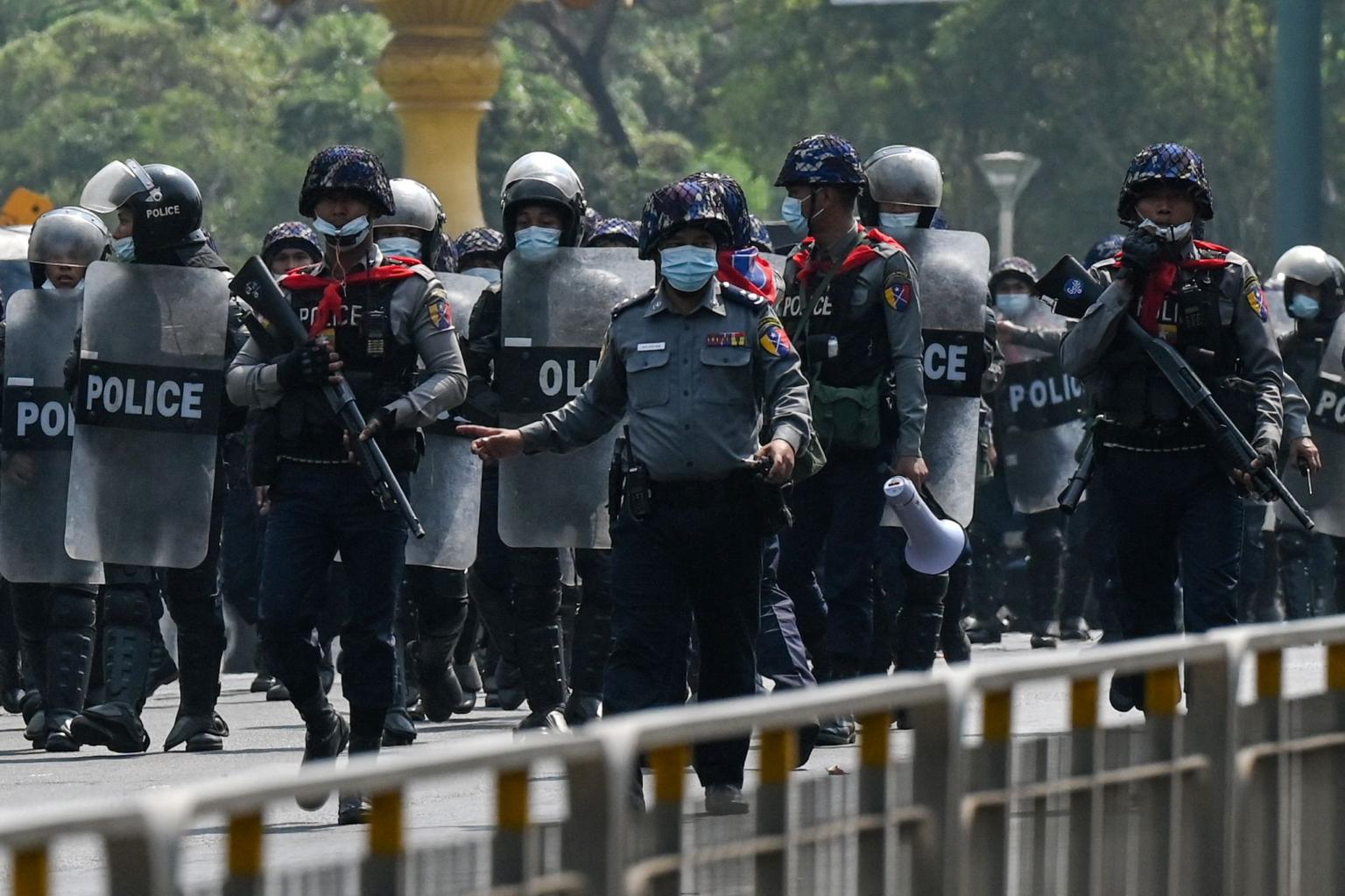 Police advance towards protesters demonstrating against the military coup in Yangon, on Feb 22, 2021.