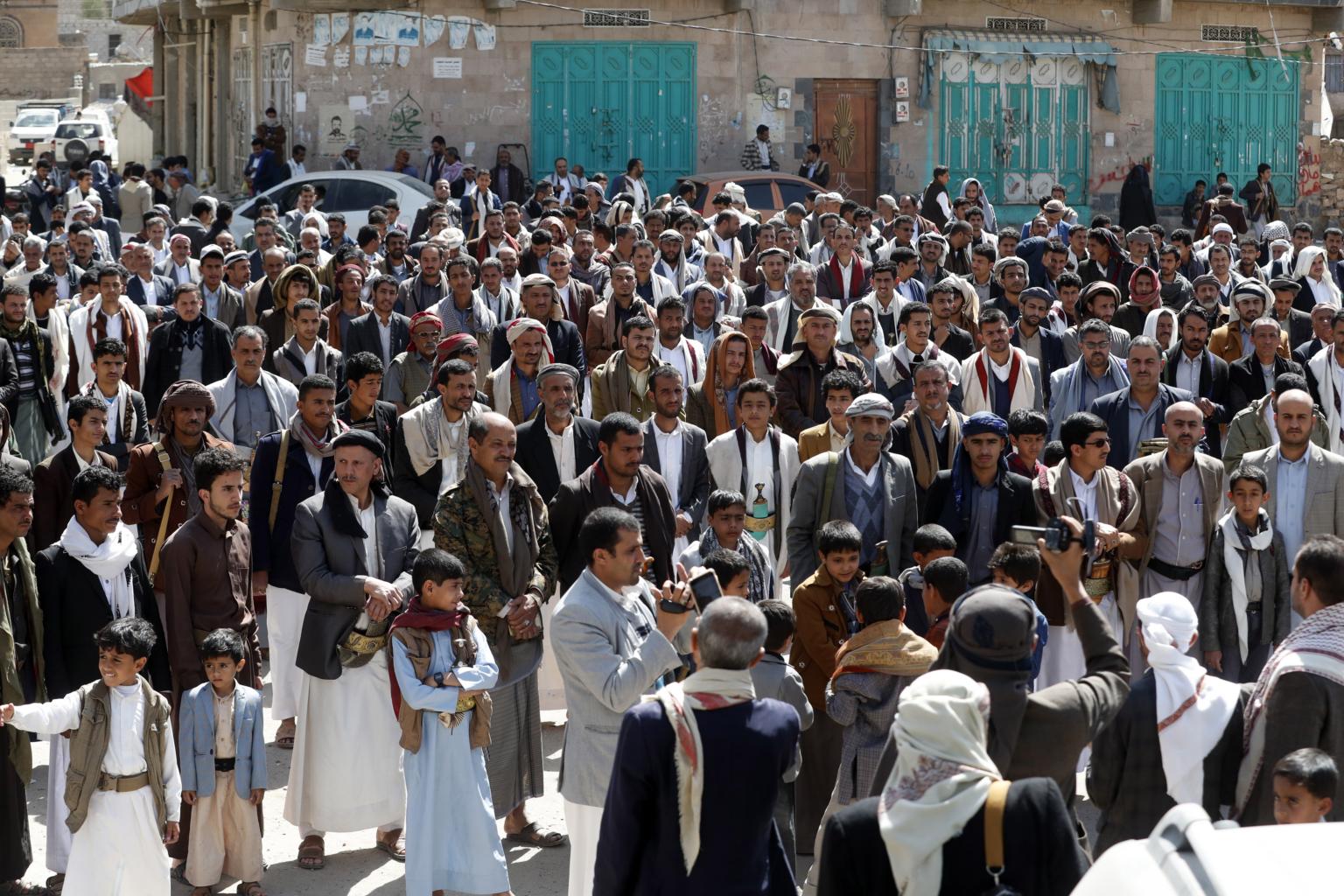 Houthis-allied Yemenis attend an anti-US and Saudi rally outside a mosque in Sana’a, Yemen, on Feb 5, 2021.
