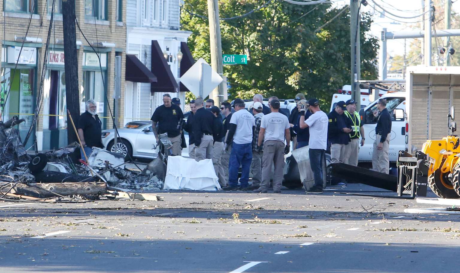 Investigators are seen at the scene of a twin-engine plane that struck a utility pole and burst into flames in downtown East Hartford, Connecticut US, Oct 12, 2016.