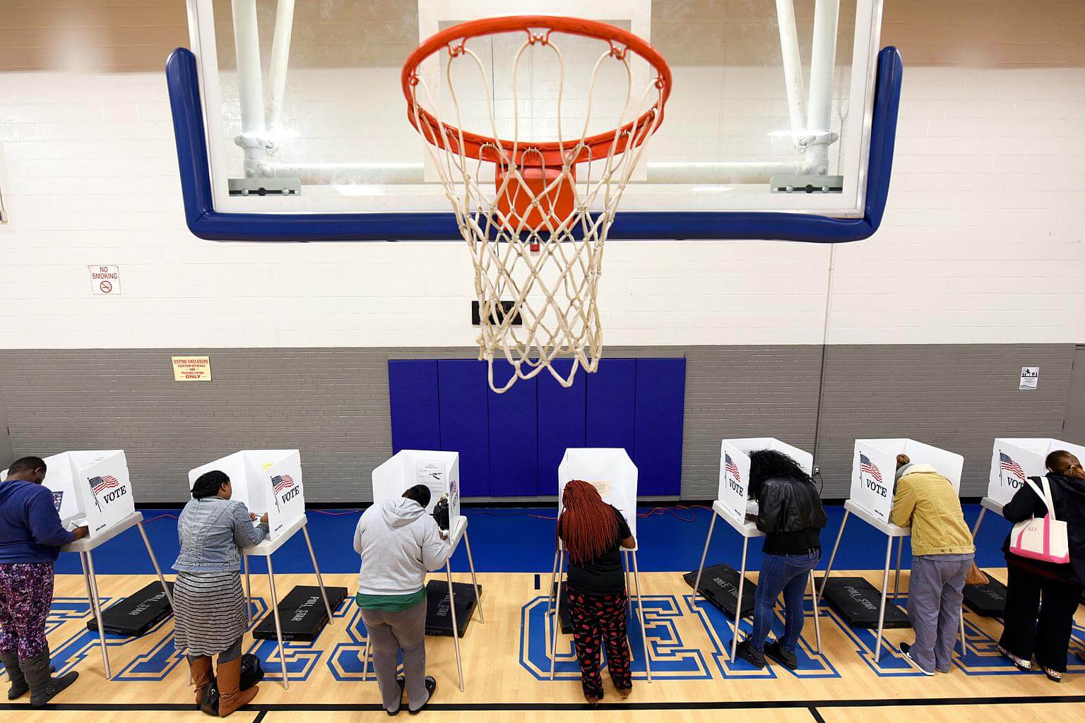 Citizens vote on a basketball court at a recreation center serving as polling place during the US general election in Greenville, on Nov 8, 2016.