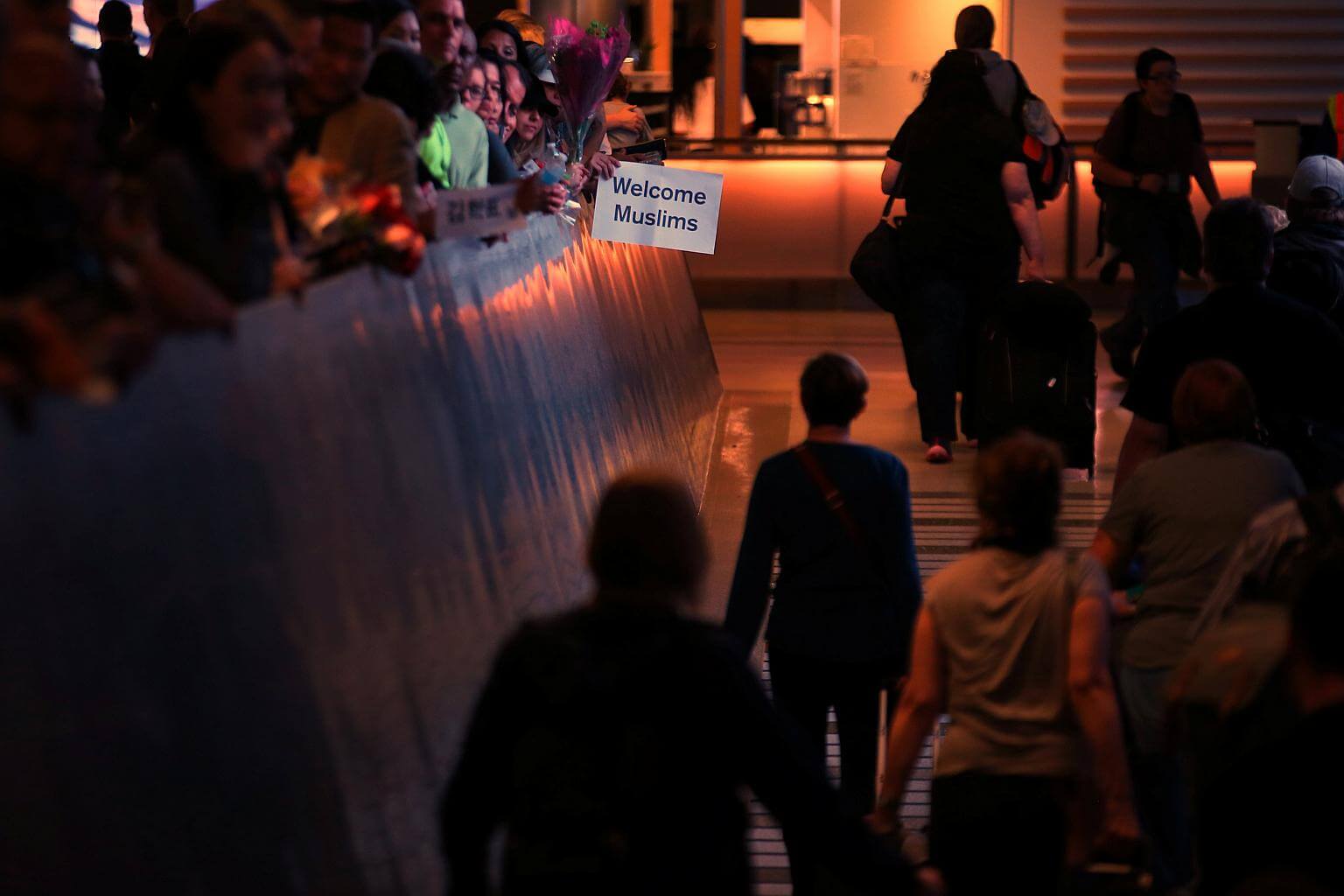 Retired engineer John Wider, 59, holds up a sign reading "Welcome Muslims" as international travelers arrive at Los Angeles International Airport on June 29, 2017.