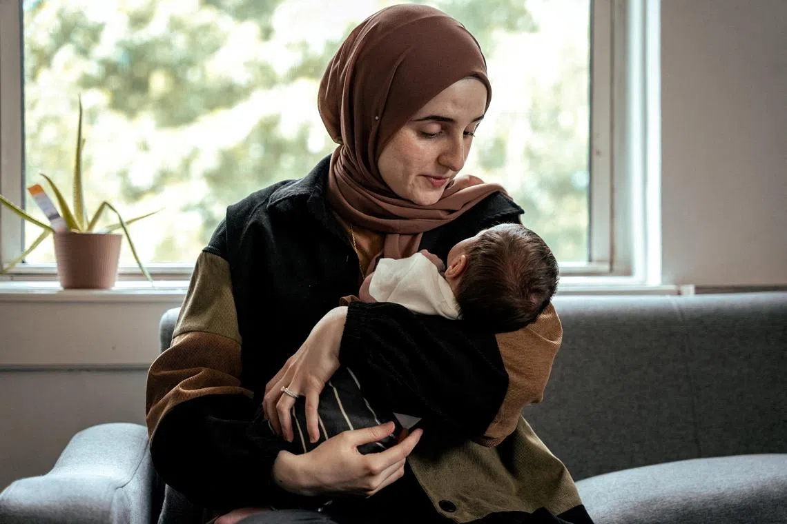 Dr Noor Abdalla, Mr Khalil’s wife and a US citizen, at home with their baby son.