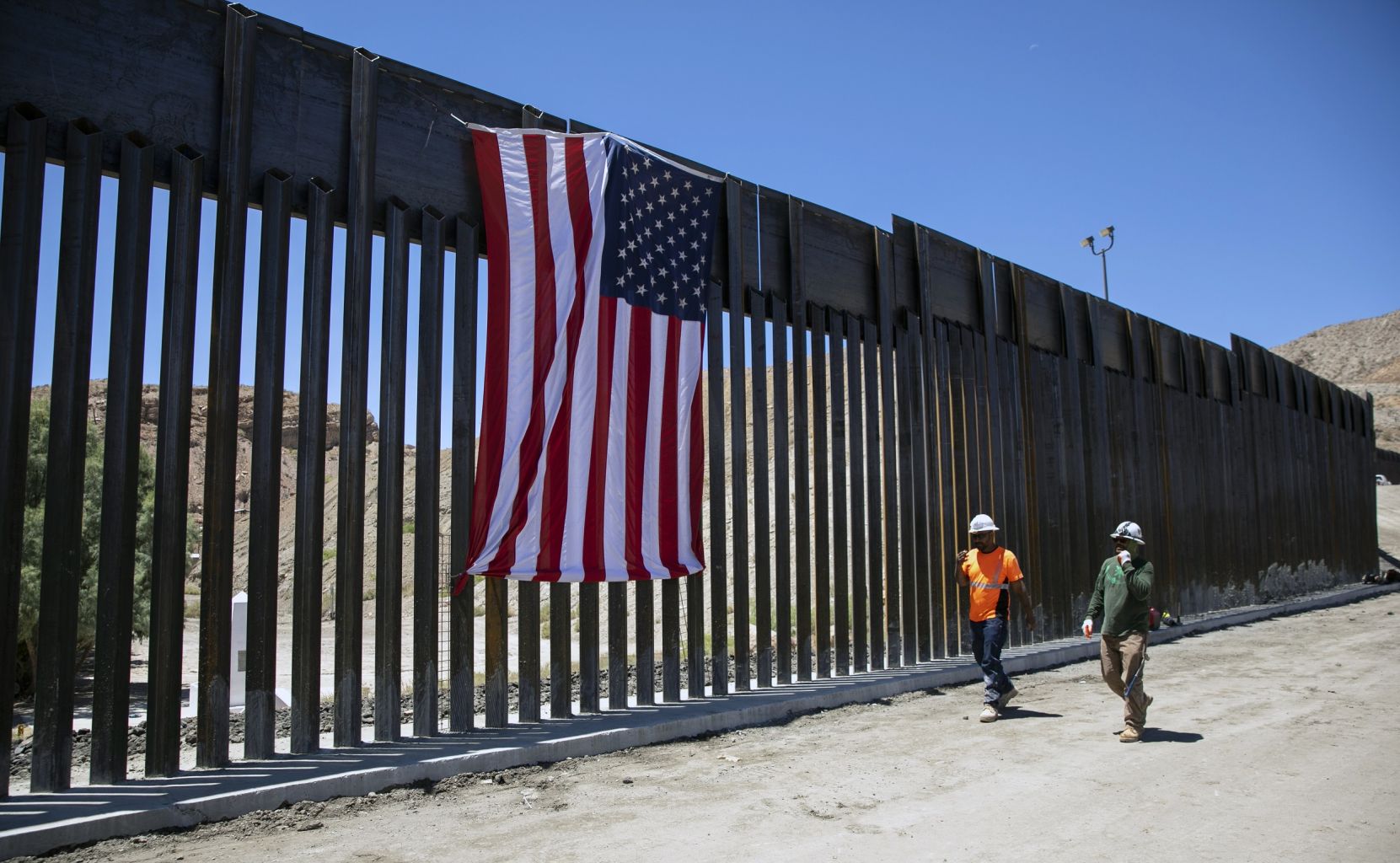 Construction workers walk past a new barrier on the border with Mexico, on May 28, 2019.