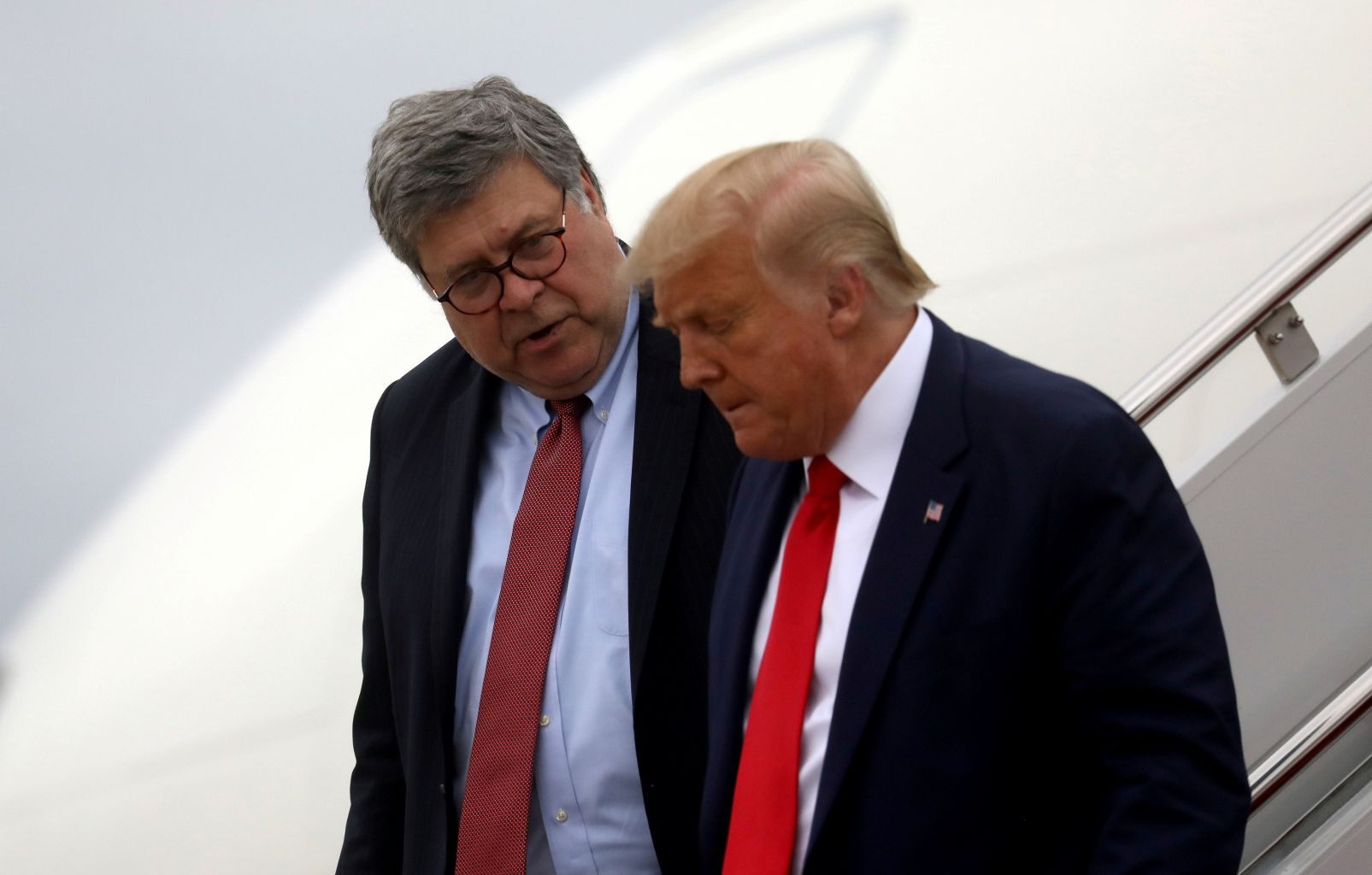 Barr (left) and Trump disembark Air Force One in Washington in September 2020.