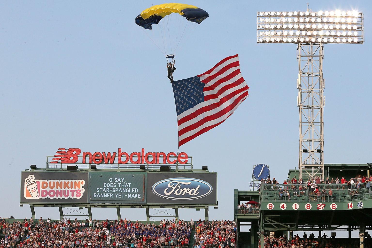 A US Navy Seal landing before a game at the Houston Astros in Boston on July 3.