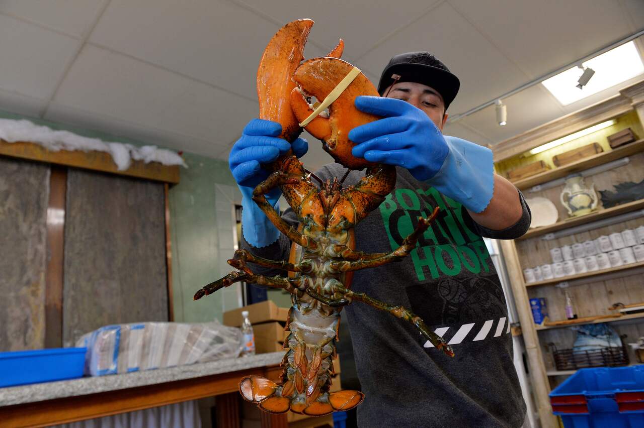 An employee picks up a lobster at Ipswich Shellfish in Massachusetts, on March 26, 2020.