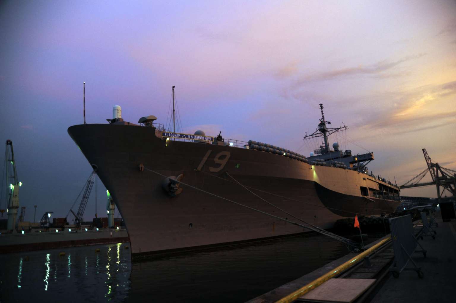 The sun sets behind the USS Blue Ridge - the flagship for the Navy's 7th Fleet - during a port visit to Jakarta, Indonesia.