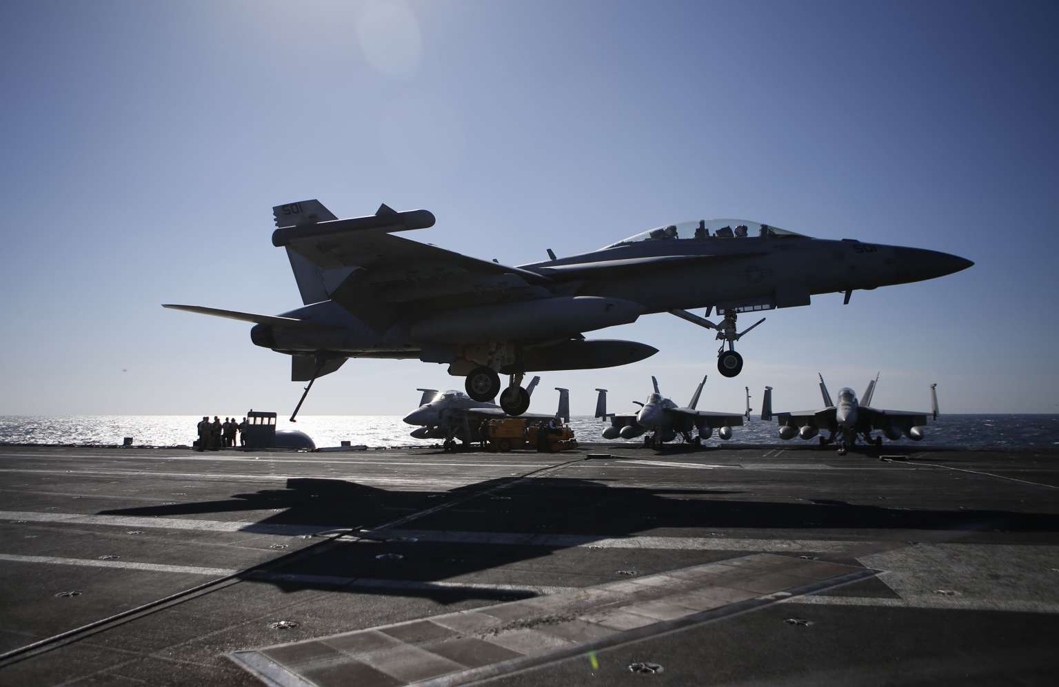 A US Navy F/A-18 Super Hornet fighter lands onto the deck of the USS Ronald Reagan, a Nimitz-class nuclear-powered aircraft carrier, during a joint naval drill between South Korea and the US in the West Sea off South Korea on Oct 28, 2015.