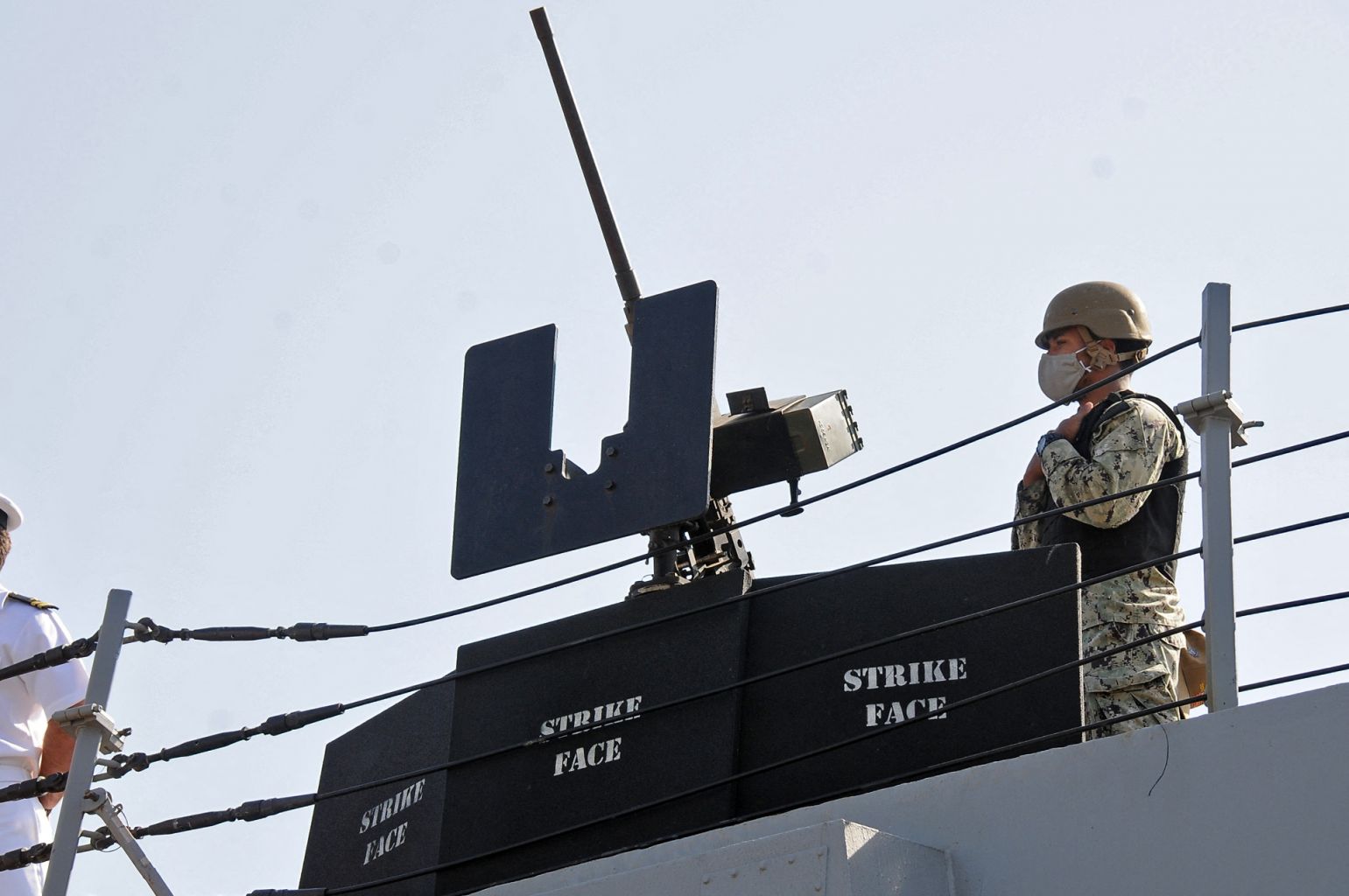A US sailor looks on while standing aboard a US Navy destroyer on March 1, 2021.