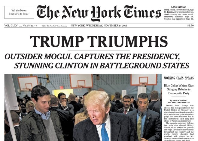 The New York Times print cover for Wednesday. US newspapers reacted with eye-catching headlines after Trump's win.