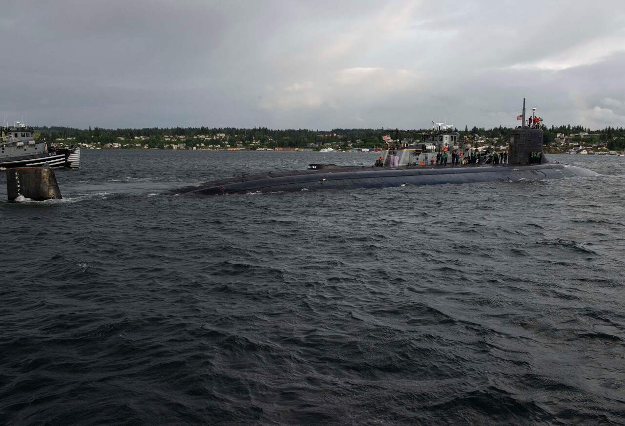The Seawolf-class fast-attack submarine USS Connecticut (SSN 22) departs Naval Base Kitsap-Bremerton for deployment in Bremerton, Washington on May 27, 2021.
