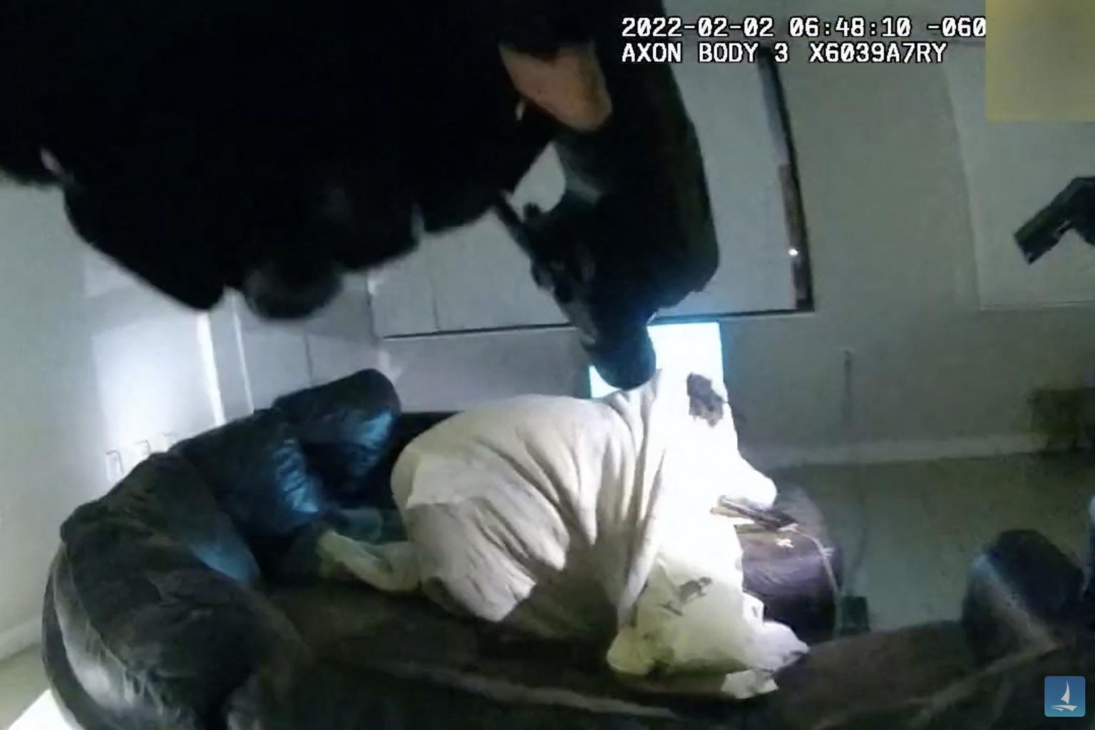 A screengrab from the Minneapolis Police Department body camera footage shows Amir Locke on a sofa under a blanket before being shot.