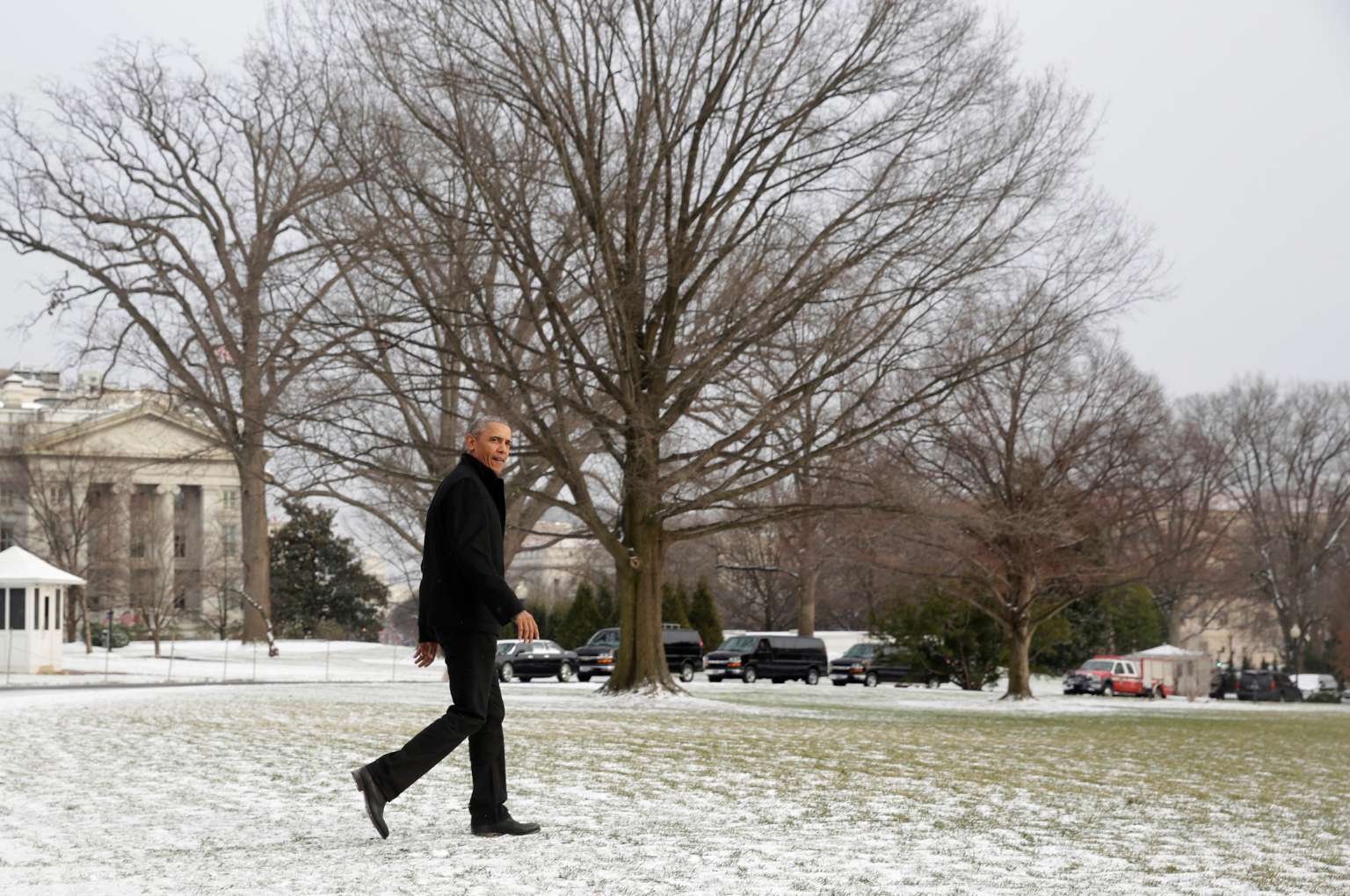 US President Barack Obama walks through the snow to Marine One as he departs the White House in Washington on Saturday (Jan 7, 2017).