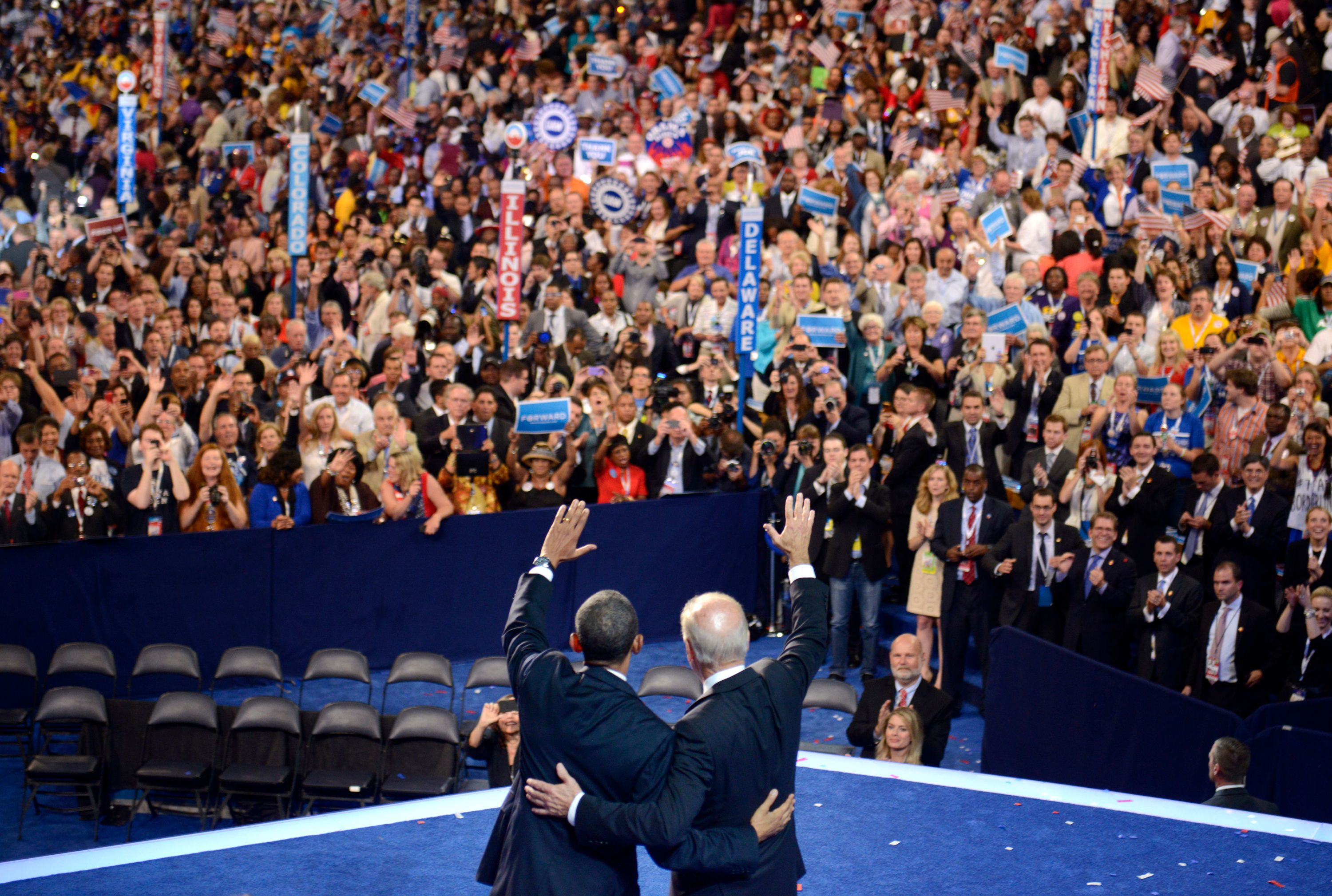 In a photo taken on Sept 6, 2012, former US President Barack Obama (left) and former vice-president Joe Biden acknowledge the audience at the Democratic National Convention in North Carolina.