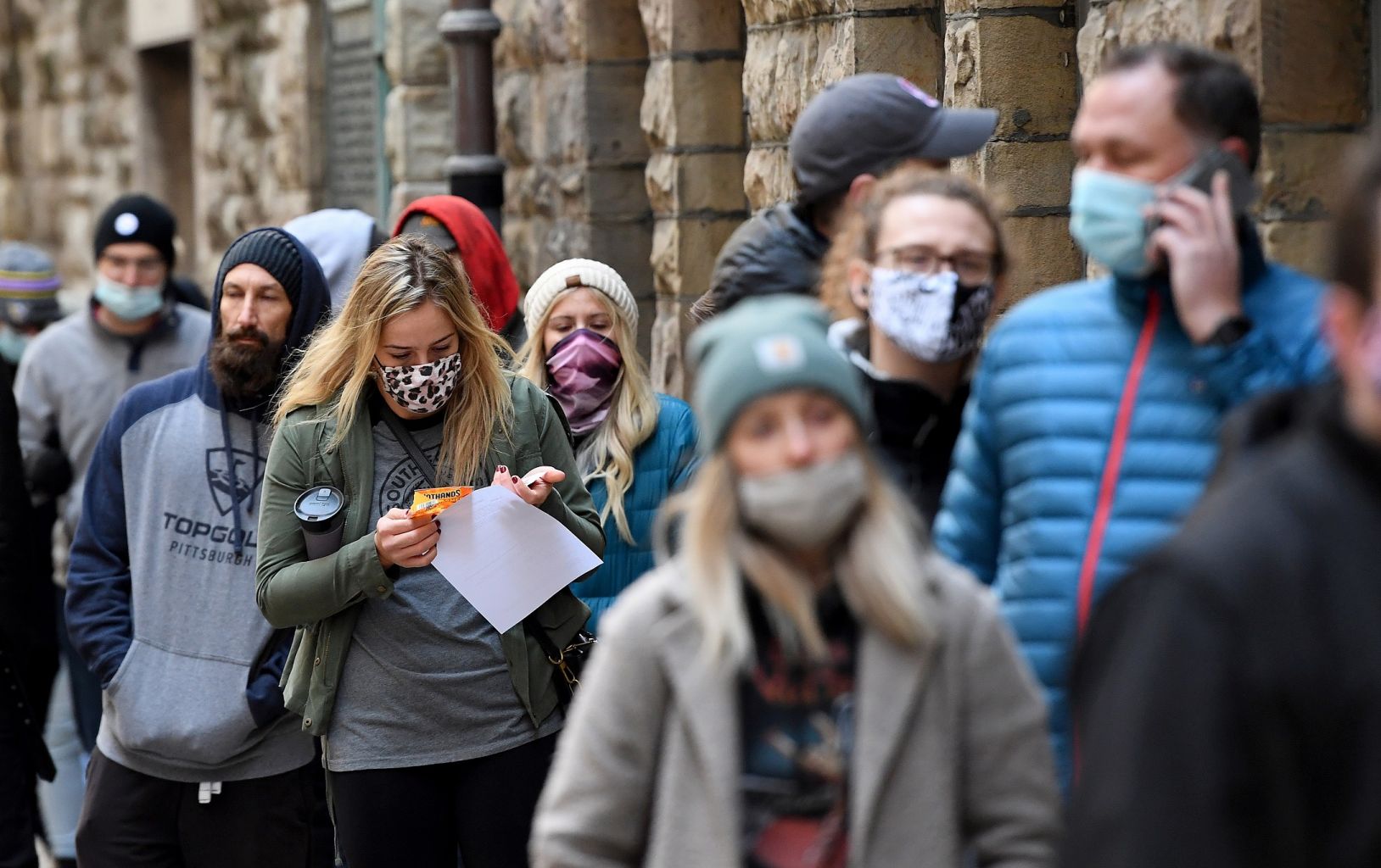 Voters wait in line at a polling location in Pittsburgh, Pennsylvania, Nov 3, 2020.