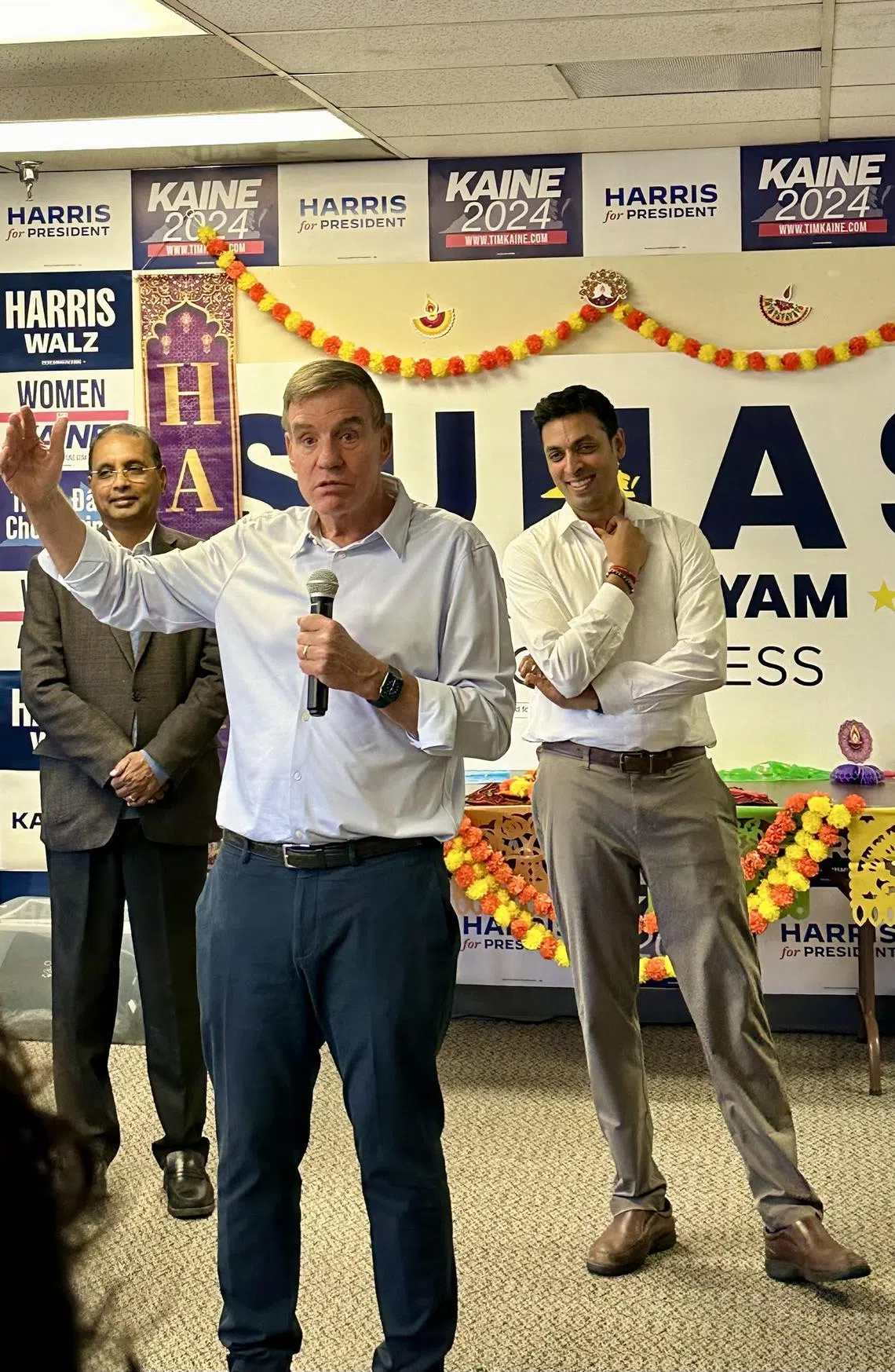 Democratic Senator Mark Warner stumping for Vice-President Kamala Harris at an event in Virginia on Oct 19.